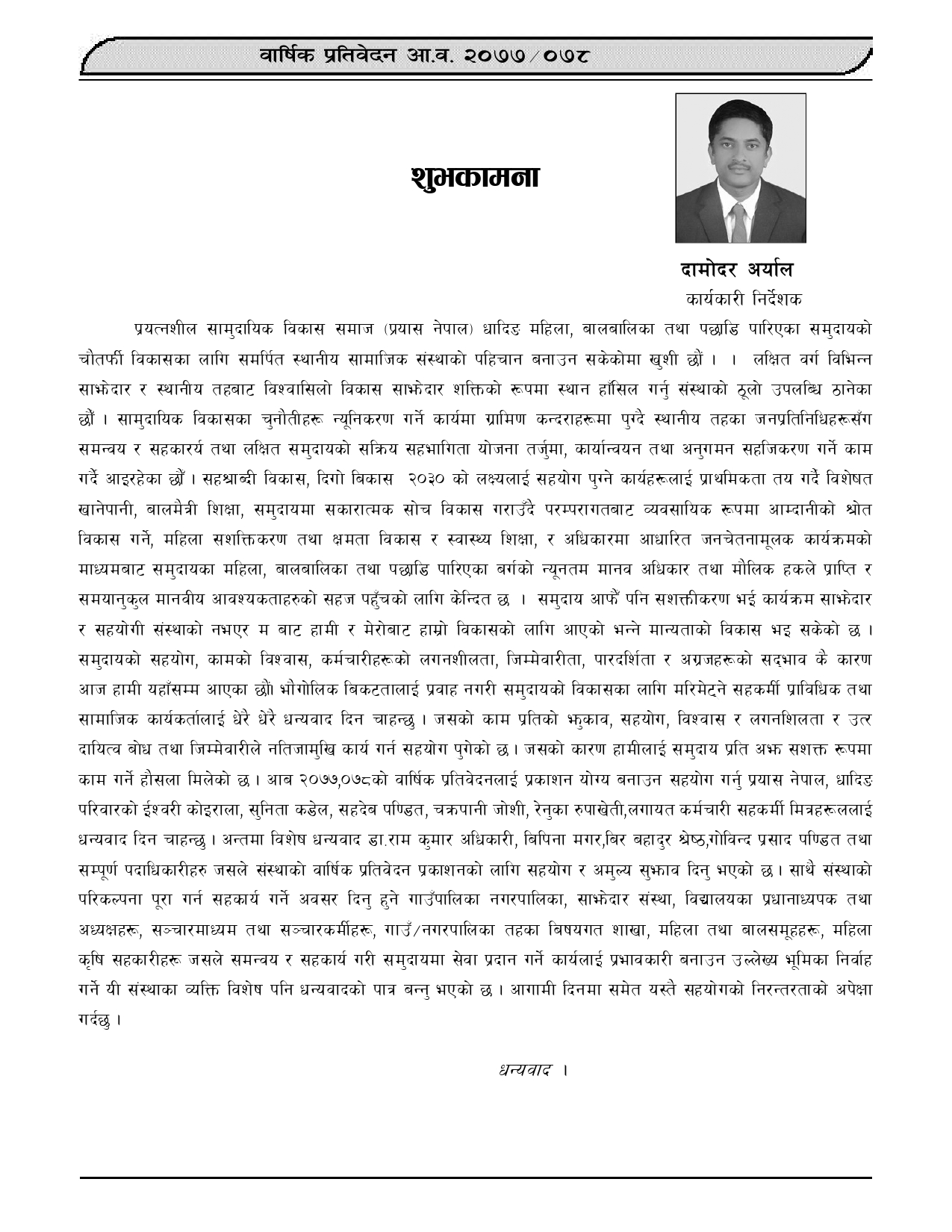 I would like to thank family members of Prayas Nepal, Dhading Ishwori Koirala, Sunita Kadel, Sahadev Pandit, Chakrapani Joshi, Renuka Rupakheti, and other staff colleagues for their efforts to make the annual report of 2077,078 publishable. Special thanks to Dr. Ram Kumar Adhikari, Bipina Magar, Bir Bahadur Shrestha, Govind Prasad Pandit, and all the office bearers for their support and invaluable suggestions for the publication of the annual report of the organization.